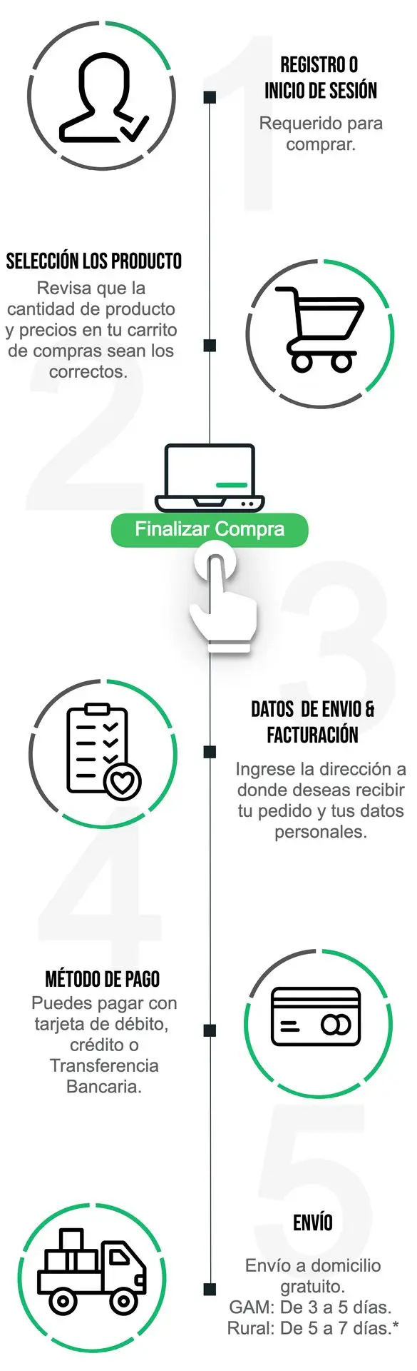 Importante: Tome en cuenta que cuando finalizas su compra se tarda de 1 a 2 días en surtir tu orden, posteriormente se genera la guía y comienza a tener movimiento el estatus. El tiempo de entrega puede extenderse debido a causas de fuerza mayor, que están fuera de nuestro control.