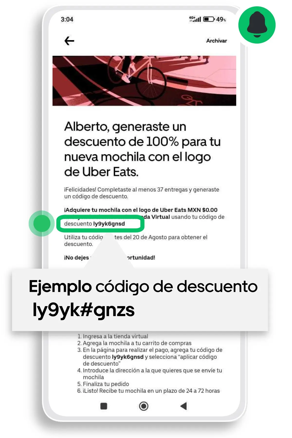1. Recibirá una notificación directamente en su aplicación de Uber Repartidor con su código de descuento.