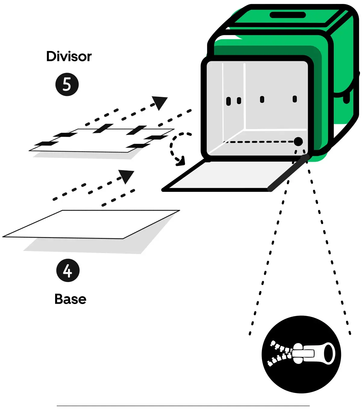 3. Abra el compartimento frontal de la mochila y expándalo; ubique el zipper en la base e introduzca la pieza de polipropileno de 22 x 46 cm. Luego coloque el divisor ajustándolo con las partes de velcro.